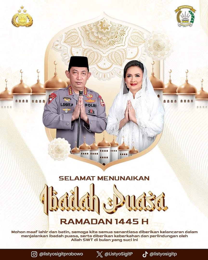 JAKARTA, Kabarrakyat.co.id, — Kapolri Jenderal Listyo Sigit Prabowo turut mengucapkan selamat menjalani ibadah puasa di bulan Ramadhan kepada seluruh umat Islam dimanapun berada. Ucapan Kapolri itu mewakili keluarga besar institusi Polri dan Bhayangkari“Saya Jenderal Polisi Drs. Listyo Sigit Prabowo, M.Si., Kepala Kepolisian Negara Republik Indonesia, atas nama keluarga Polri dan Bhayangkari, mengucapkan selamat menunaikan ibadah puasa ramadhan 1445 H. Ramadhan penuh berkah untuk Indonesia Emas 2045,” ucap Kapolri seperti dikutip dari video yang diunggah di Instagram resmi @listyosigitprabowo, Senin (11/03).