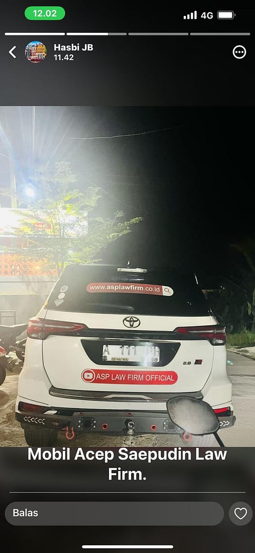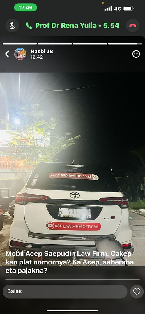 LEBAK, Kabarrakyat.co.id, — Acep Saepudin Pengacara Kondang Kelahiran lebak tersinggung atas postingan setatus WhatsApp Bupati Lebak ( Hasbi ) yang memampang mobil milik Acep dengan kata-kata ” Mobil Acep Saepudin Law Firm. Cakep Kan Plat Nomornya ? Ka Acep, Saberaha Eta Pajakna “. ( 4 Maret 2025 )