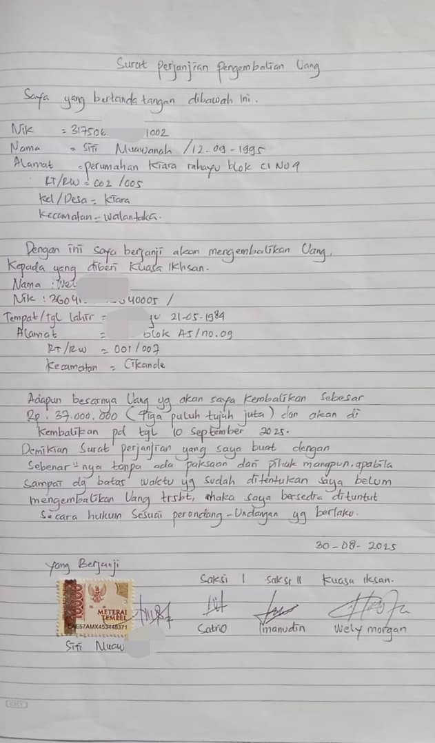 Terus pagi ngabarin lagi bahwa ngga jadi hari ini untuk interview nya,batal nanti dikabarin lagi,saya tunggu tunggu katanya nanti juga ada panggilan lagi bulan depan sampai sekarang ngga ada kejelasan nya,mana uang itu saya dapat pinjem bang,janji saya ngga lama buat balikin nya,karena lama akhirnya terpaksa saya gadaikan sawah orang tua saya,malu saya bang sama orang tua,kalo emang ngga masuk kerja balikin uang saya,saya gituin ke si Siti Muawanah nya itu bang,beralasan terus dia diminta balikin uang saya,pungkasnya ikhsan dengan nada kesal