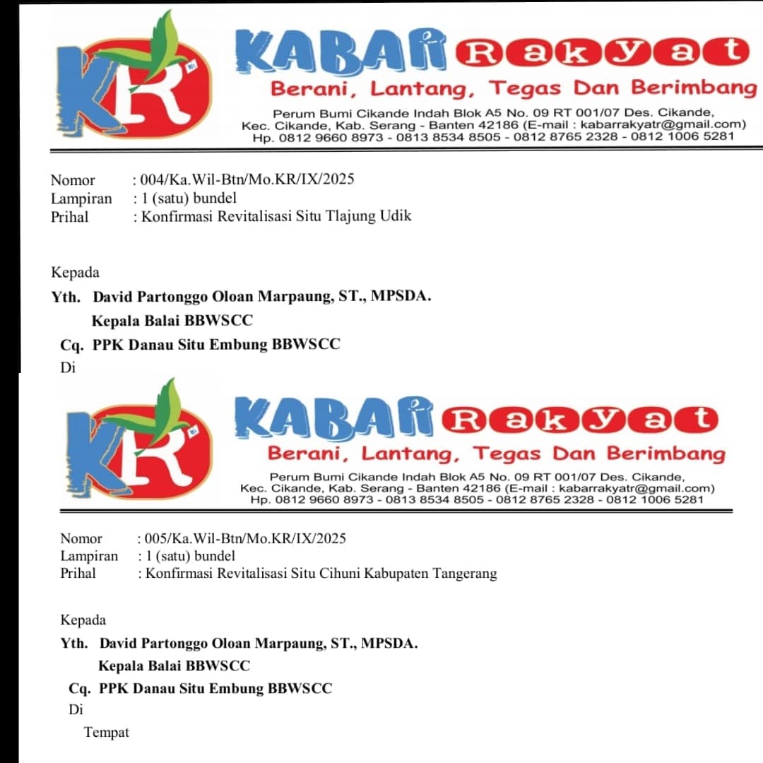 Lebih lanjut, upaya mengali,mencari informasi yang lebih faktual dan berimbang pada setiap bagian isi narasi muatan berita yang tersaji, dapat meng edukasi ketika di konsumsi publik/pembaca secara umum. Guna mewujudkan informasi yang dimaksud, awak media melalui Kaperwil. Banten melakukan konfirmasi tertulis dengan surat konfirmasi. Nomor : 004/K.a.Wil- Btn/M.o.-KR/IX/2025, Lampiran : 1 (satu) Bundel, Prihal : Konfirmasi Revitalisasi Situ Tlajung Udik, tertanggal 29 september 2025 ditujukan kepada yth. David Partonngo Oloan Marpaung,ST, MPSDA selaku kepala BBWSCC, Cq. PPK Situ Embung, bahkan dalam waktu secara bersamaan surat Nomor : 005/K.a.Wil- Btn/M.o.-KR/IX/2025, Lampiran : 1 (satu) Bundel, Prihal : Konfirmasi Revitalisasi Situ Cihuni yang ditujukan kepada pejabat yang sama seperti surat nomor: 004.