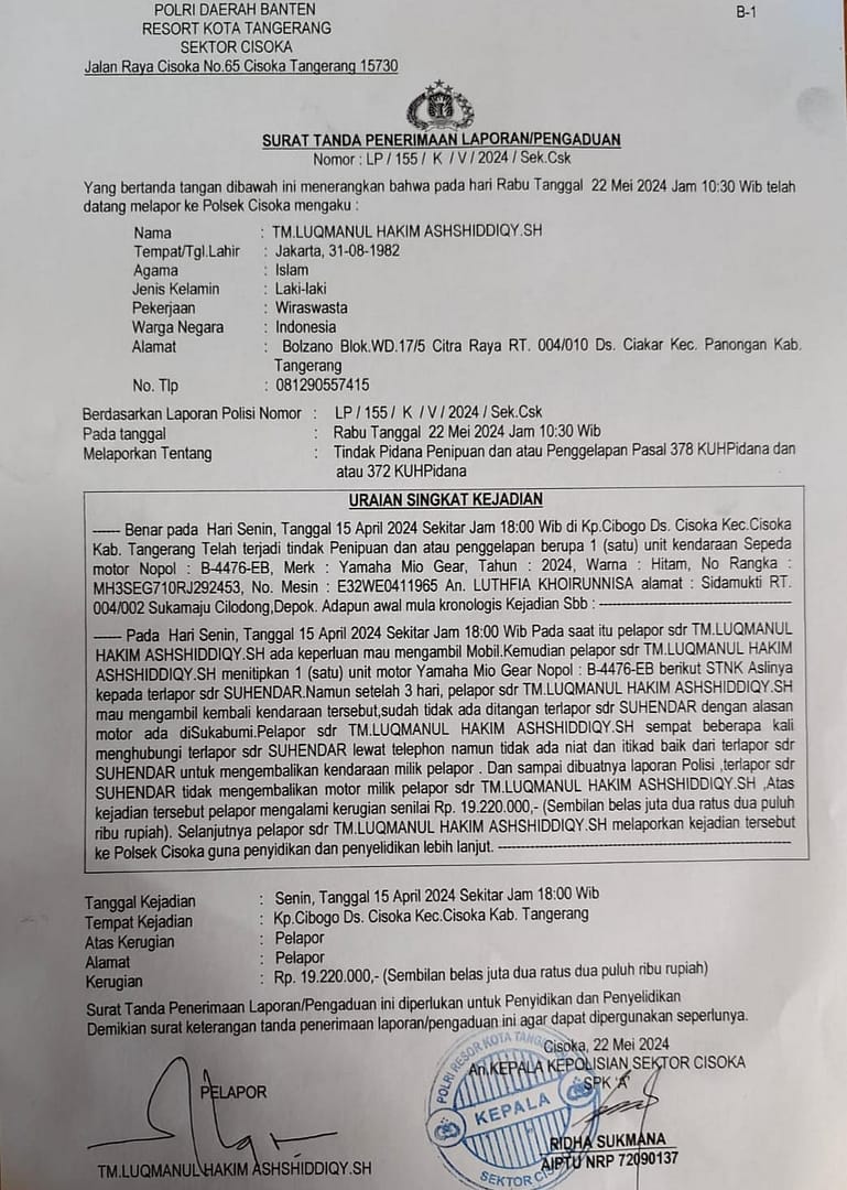 Sebelumnya diketahui bahwa Teuku Luqmanul Hakim SH. adalah seorang pengacara yang telah menjadi korban tindak pidana penipuan dan penggelapan 1 unit sepeda motor jenis matic merek Yamaha Mio Gear dengan Nomor Polisi B 4476 EBE tahun keluaran 2024, yang diduga dilakukan oleh seorang pemuda bernama Suhendar alias Endang Warga Kabupaten Sukabumi Jawa barat, yang berdomisili di Tangerang Banten.